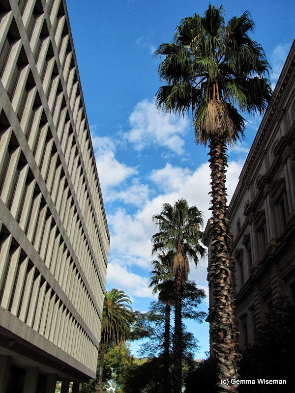 view of autumn skies glimpsed between buildings near the Treasury Gardens, Melbourne...